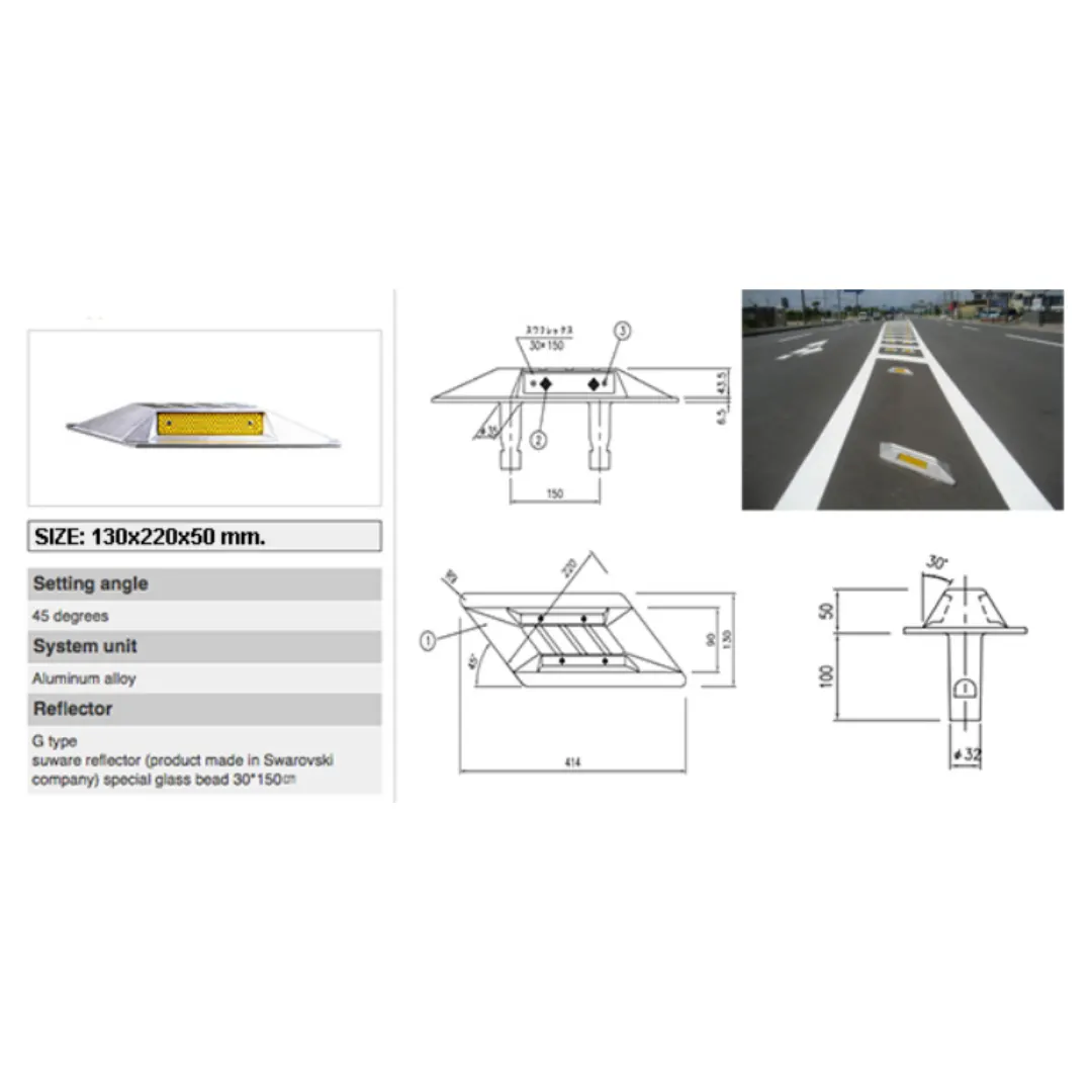 • หมุดถนนทำมุมเอียงรับ 45 องศา เพื่อสะท้อนในระดับสายตาได้ดี